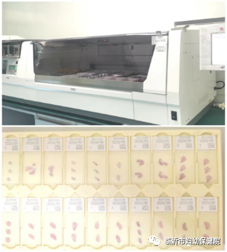 切好的片子就像一张白布,显微镜下看不出什么来,技术员将白片烤上30分钟,防止脱片,然后经过全自动染色机24道染色步骤,这一张张白片就像穿上了五彩斑斓的衣服。