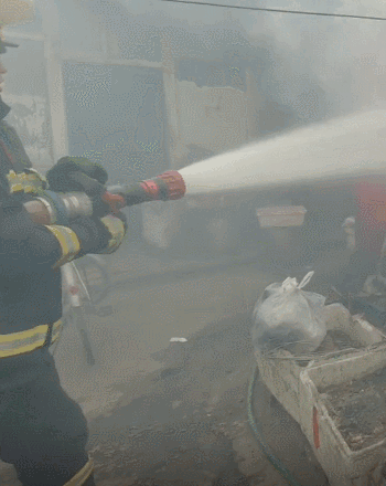 一居民家的狗窝着火,消防员们迅速赶到开始救火。