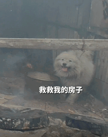 看着水柱的方向,仿佛在喊加油!只是救完火之后,白狗变黑狗