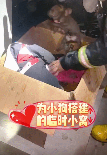 其中先就出来了一群狗宝宝,消防员先将它们安置在纸箱中。