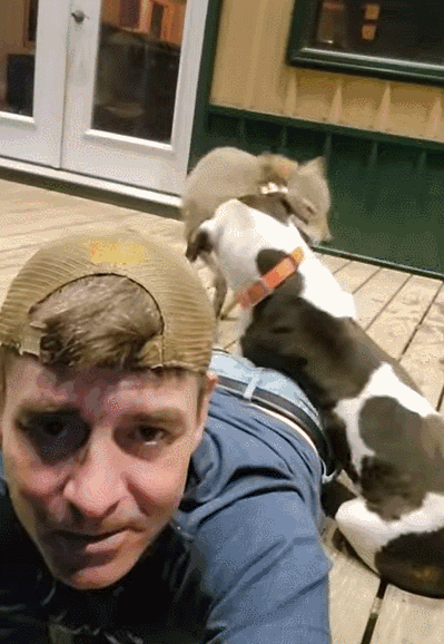 带着他养的比特犬“鸭鸭”