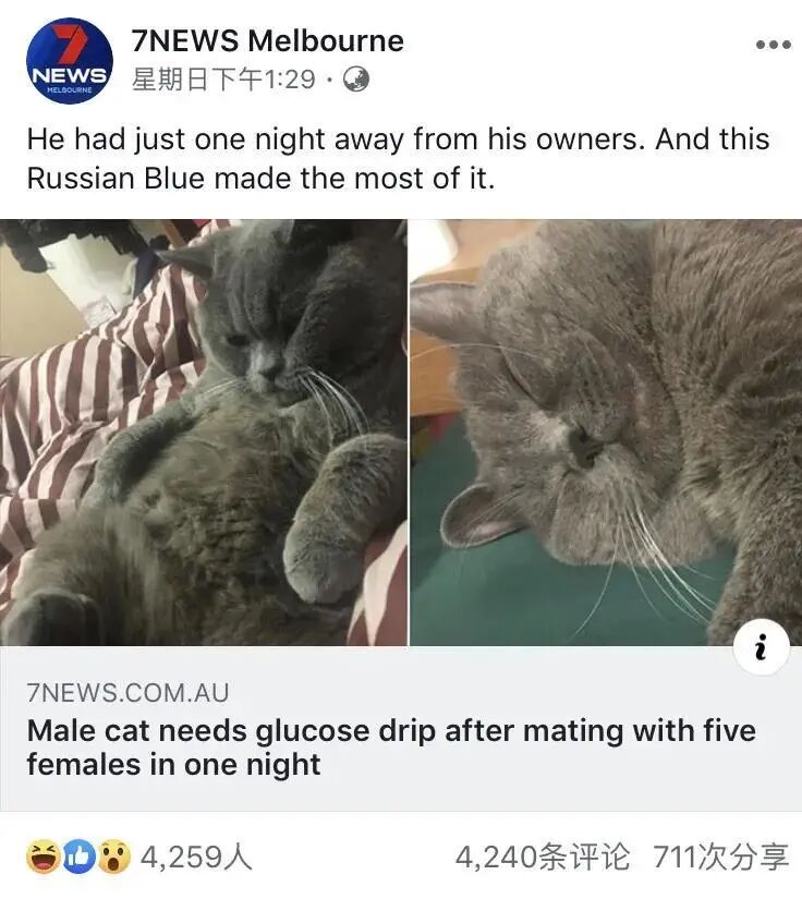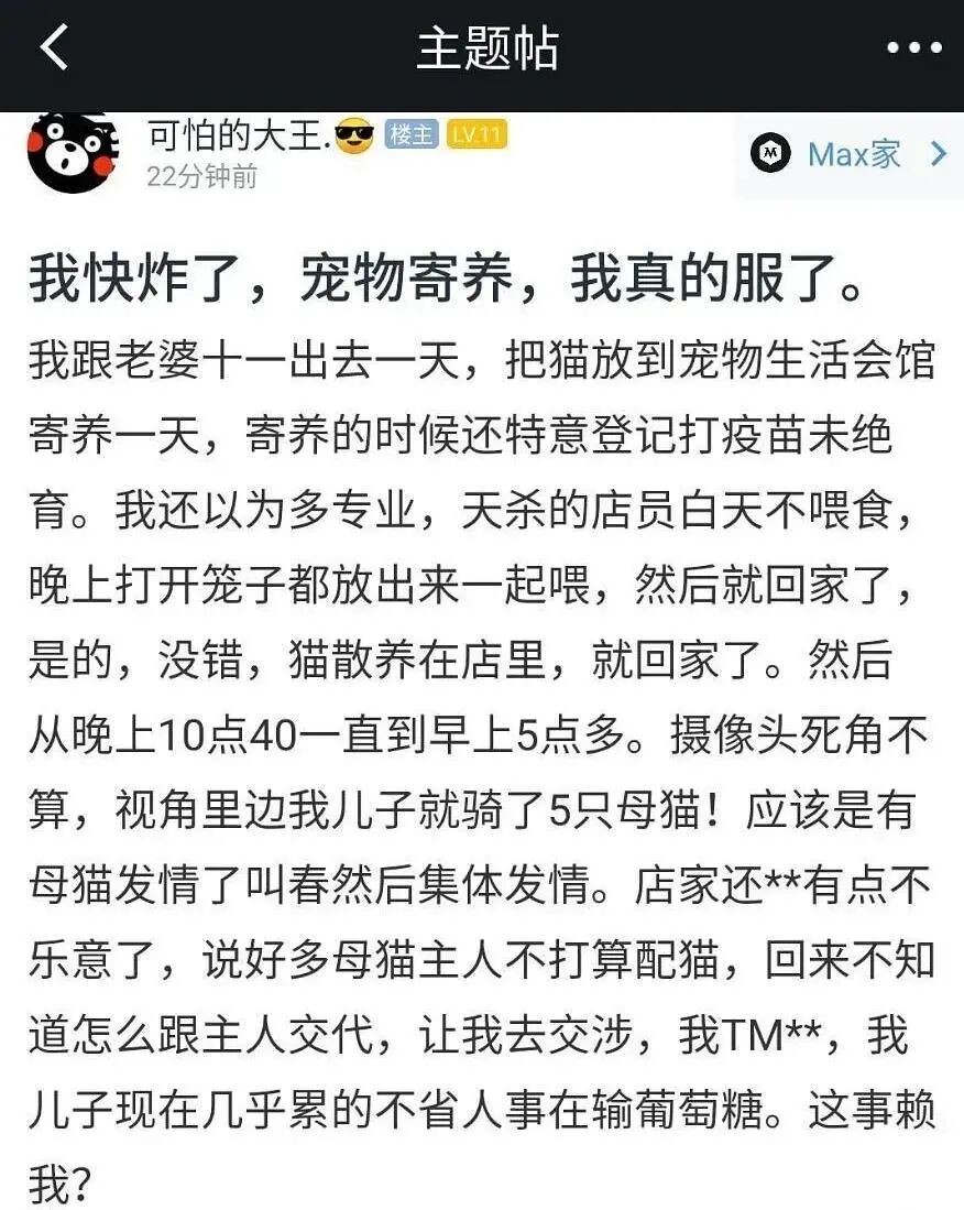 之前有只蓝猫被寄养店家散养,一夜五次喜当爹,最后累到进医院输葡萄糖