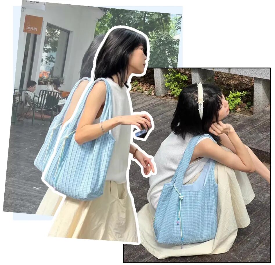 来一个超大容量的!这款出街上镜不说,日常背那是造型&方便一手拿捏耶!休闲托特包包,应该是通勤人最会爱的一款包型,配合上亮眼柔和的冰蓝色,一整个清凉解暑的风格hhh,连肤色都能给衬白三分!