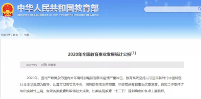 2021年8月27日,教育部网站公布了《2020年全国教育事业发展统计公报》。《公报》显示,全国共有普通高校2738所,比上年增加50所。其中,本科院校1270所(含本科层次职业学校21所),比上年增加5所;研究生培养机构827个,其中,普通高等学校594个,科研机构233个。研究生招生110.66万人,比上年增加19.00万人,增长20.74%。普通本专科招生967.45万人,比上年增加52.55万人,增长5.74%。