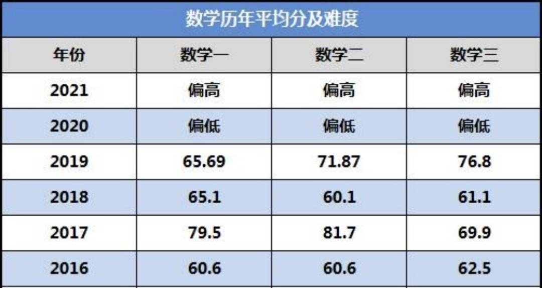 教育部没有公布考研数学2020和2021年的平均分,只给出了偏高和偏低的说法。2020年平均分偏低,说明题型较难,所以在2021年的时候,调整了命题思路,这样就使得21年数学平均分普遍偏高。从表中可以看出每年都有一定的波动,但都在60分以上。按照数学出题难度“一大年(难)一小年(简单)”交替的原则,2022考研可能是“大年”,很多同学会问22年会不会比往年更难,根据高教社一直强调的“区分度”,学姐认为过国家线不难,但是考高分难,大部分人可能都会集中在60~90分之间。