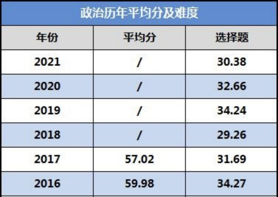 由于官方没有给出18 -21年的考研政治平均分数据,所以大家只能看16-17年的了。根据以往的经验,政治是属于中等难度的,平均分在58分左右,这也说明考研政治的难度比较稳定,大家不会在这一科目上被甩开分数。当时学姐身边的研友都过线了,2022年政治大纲也只是例行调整,稍作了改动,除了时政内容外,大家可以按照近几年的真题和资料去准备,跟紧肖爸爸就没问题。