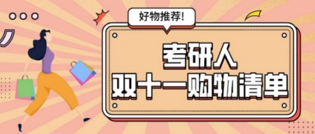 一年一度的双十一又到了,各大软件,从微信到短信,种种活动充斥在我们眼前,平台真是无孔不入。但对于我们考研人来说,今年的双十一和往年有些不一样呀,我们不再疯狂购物,而是在奋笔疾书。有些人说考研人不配有双十一,都到了这么紧张的阶段了,怎么还能逛淘宝呢!那我就要说:No,No,No,考研人当然可以拥有双十一,但考研人的双十一,绝不是简单的shopping,是最有用的物资储备期!