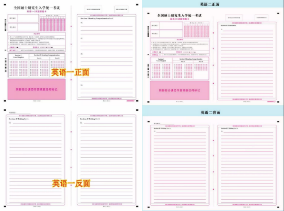 考研英语答题卡只有一张四页(第一页是选择、第二页是翻译、第三页小作文、第四页大作文)。新题型那里要注意一下,它的选项有A、B、C、D、E、F、G选项,这和四六级的长篇阅读类似。写大小作文时,大家要合理安排空间,不要写到最后没有位置了。