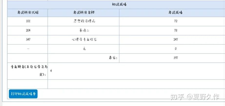 初试公布成绩的那天是元宵节,成绩查询时间是在下午五点,但听学长学姐说系统会很卡,到晚上十二点查到都是正常。于是我就很佛了,三点多还睡了一觉,醒来四点五十 ,距离查成绩还有十分钟,但我心里没有一点波澜,竟然意外的平静。到了五点,我立马点击查询,很快就出来了成绩的界面,但我第一眼不太敢看,缓了一会儿,定睛看去,397??? 有点不敢相信,于是又退出重新查询,反复确认才相信自己没有看错!!!于是就止不住的喜极而泣。(放张图给大家吸吸欧气 )
