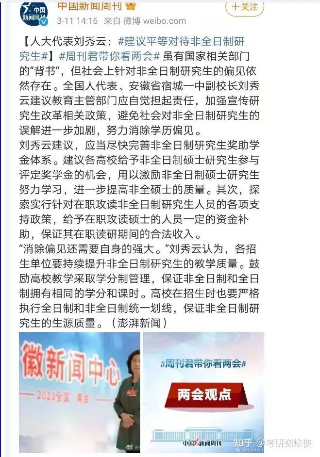 2021年两会代表提议尽快完善非全日制研究生奖助学金体系。