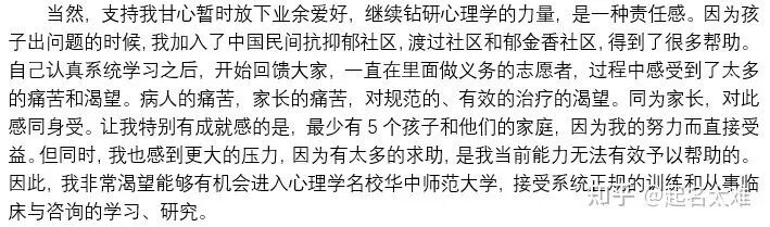 基于但不限于以上证据及个人经历体验 ,我信任心理治疗的作用,并希望能得到更多,更好地学习训练。于是决定学习,并报考华中师大的研究生。