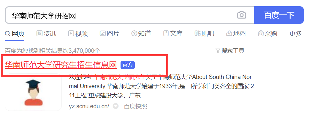 以华南师范大学为例。先百度“华南师范大学研招网”