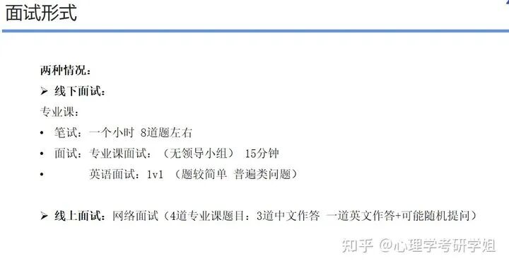 如果是线上面试: 一是要调整设备,调整角度,网速要好,也是要多加提前模拟面试,不然直接开始视频,你会觉得好尬,这样的形式就很单一,选择几道专业课题目,三道中文作答,一道英文作答。其他学校可能会有问答形式。