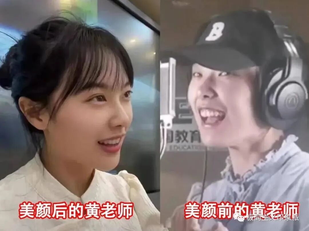 不过,比起黄老师的歌声,大家讨论的热点是她的模样,显而易见,现在的黄老师变化很大,脸型变宽了许多,五官也不似往日精致,与之前对比判若两人。之前黄老师应该使用了瘦脸、美白和大眼效果,才让自己的脸看起来美如初月,目光神采奕奕。黄老师之前被夸是美女,如今离开美颜相机,在颜值方面真是一言难尽。