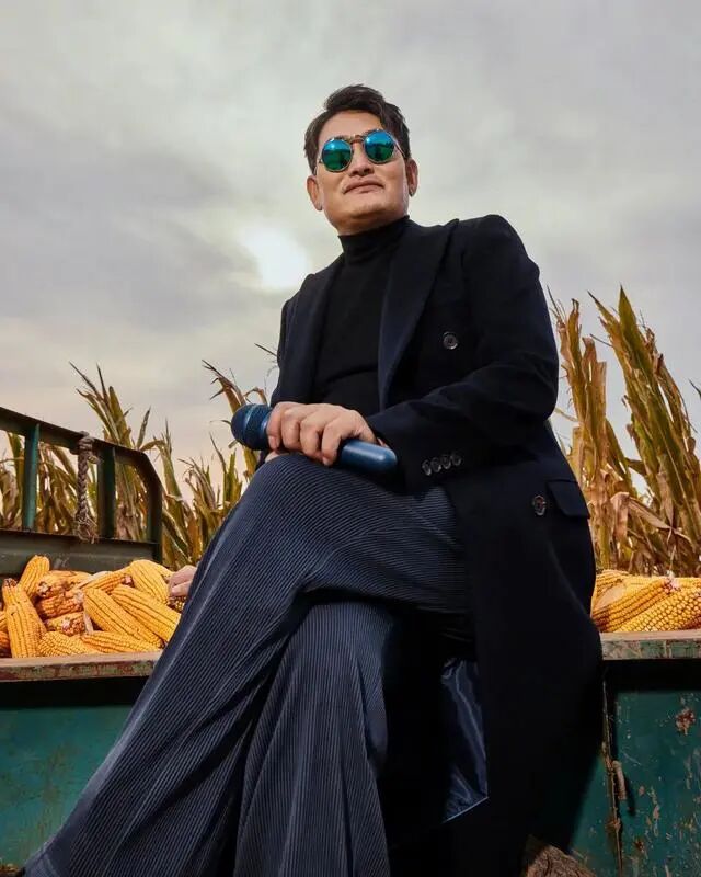 蔚蓝天空下,朱之文站在一片金黄的麦田里,身着帅气的风衣,梳着时尚的发型,戴着新潮的墨镜。