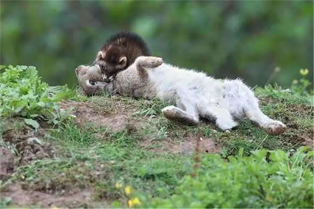 偷袭成功的林鼬,紧紧咬着野兔的脖子,把野兔咬了个半死。却还不罢休,对着野兔一顿狠揍,又是咬,又是抓,直到野兔一动不动。