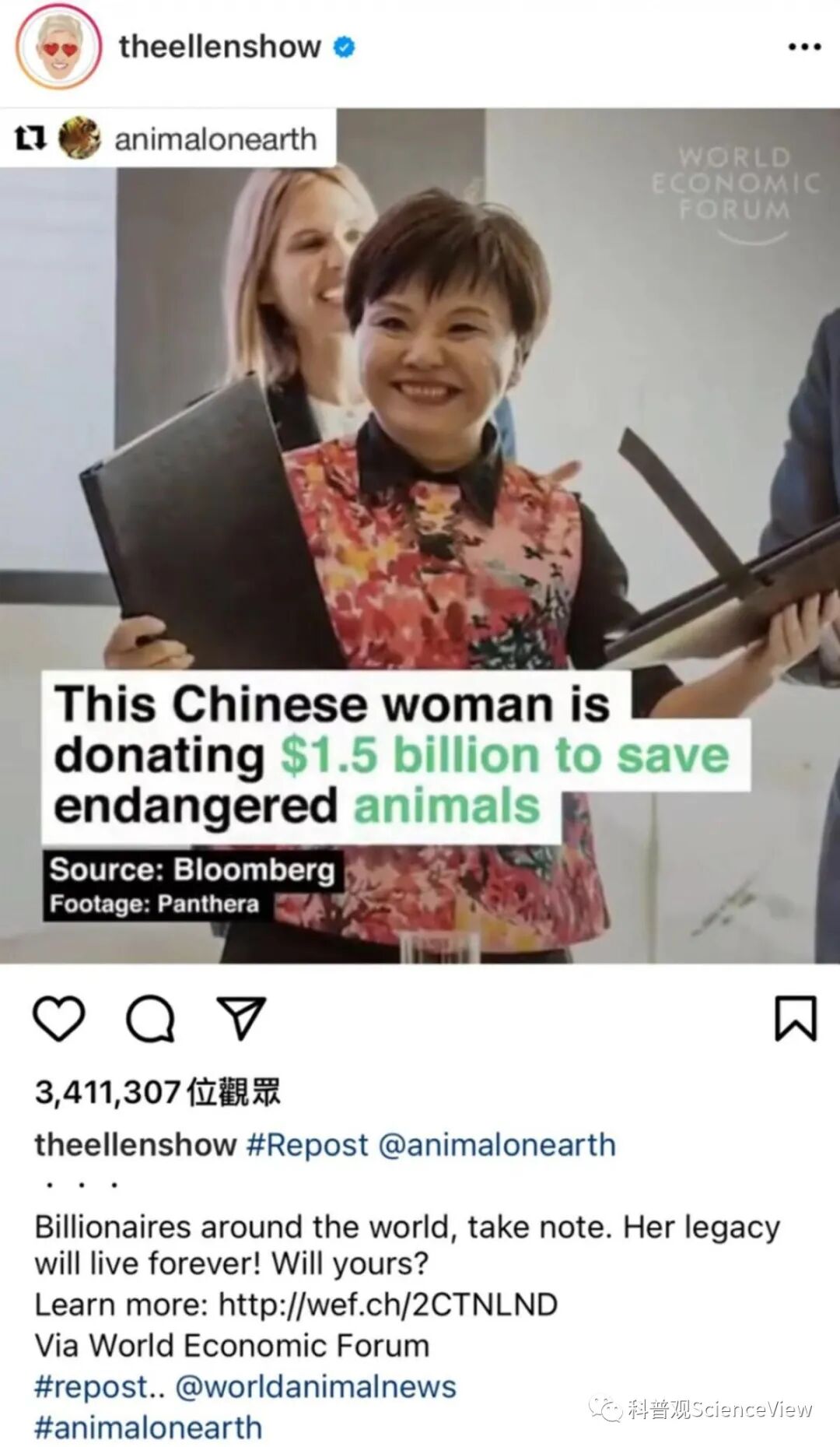 面对记者面对在场所有人,她直接表示要捐出15亿美元,折合人民币约96亿元,也就是近三分之一的身家,作为善款支持保护濒危野生动物。