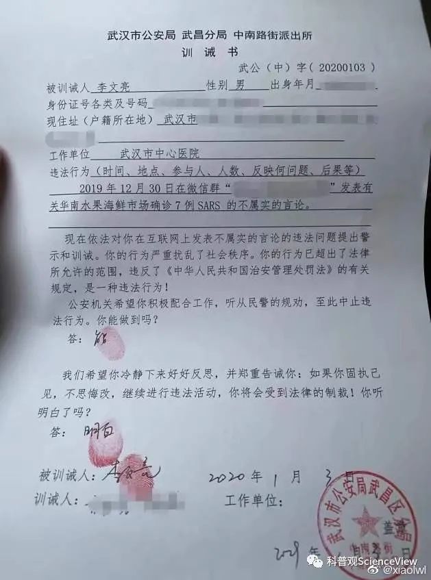 当地警方介入此事后,同样也以传播不良言论为由,对消息的“始作俑者”李文亮医生,第一时间进行了处罚和训诫,并要求他在训诫书上签字,保证以后不会再发生类似的事情。