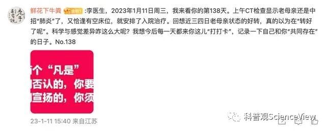 李医生,2023年1月11日周三,我来看你的第138天。上午CT检查显示老母亲还是中招“肺炎”了,又恰逢有空床位,就安排了入院治疗。回想近三四日老母亲状态的好转,真的以为在“转好了呢”。科学与感觉差异咋这么大呢?我想今后每一天都来你这儿“打打卡”,记录一下自己和你“共同存在”的日子。No.138