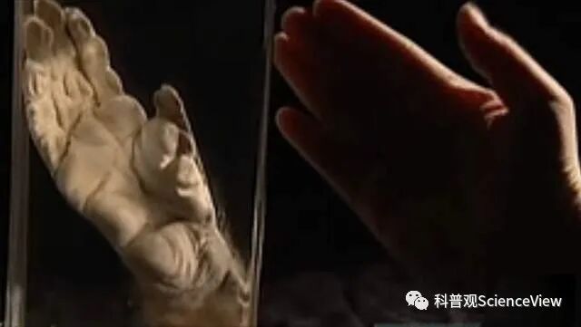 仔细观察手掌标本你会发现,这只手的大拇指是非常短的,并且还没能超过指掌关节的位置。