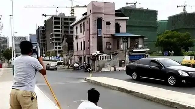 照片里这户横在马路中间的房子,就是钉子户张新国的家。这所房子的存在,愣是把原本宽阔的四车道,挤得只剩下两条车道。
