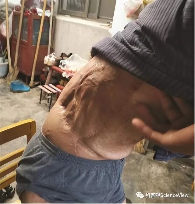 由于王大爷不同意截肢,医生只能给他打麻醉剔骨割肉,将受辐射的肌肉组织全部剔除,并从他背部移植了大量皮肤过去。