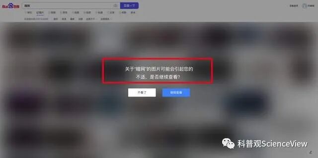 当你试图百度暗网图片,你会看到这个提示(胆小误入,否则会后悔)