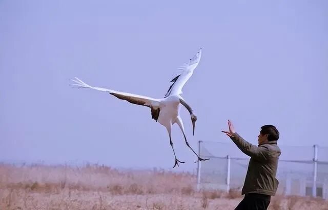 许先生远远地将鱼扔了过去,丹顶鹤快速将鱼吃掉,这一举动也促近了两者之间的距离。 许先生发现这只鹤对自己没有先前那么防备了,所以之后几天许先生都会带条鱼来看这只鹤,而他已经完全可以坐在这只丹顶鹤身旁了。