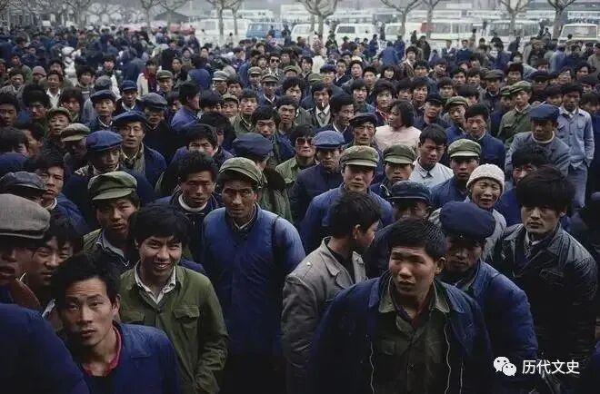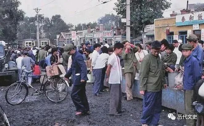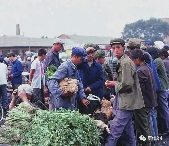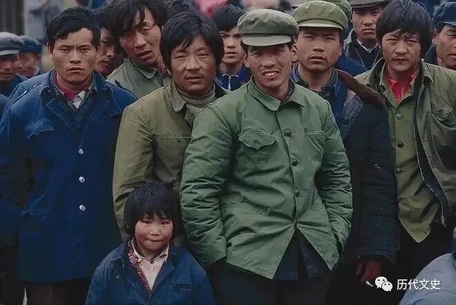 这种上下4个翻盖口袋的蓝色上衣叫“青年服”,我以前一直以为是“中山服“。青年服和中山服的区别:青年服是暗口袋,中山服是明口袋,是那时成年男人的标配,我的父亲当年也这么穿。小女孩旁边插兜穿的绿色衣服是军服,和青年服的区别就是颜色不一样,那个年代很流行穿军服。我见过但父亲没穿过绿色这种。抱着鸡这位大哥青年服配上八角帽(我不知道叫啥帽子),再配上青色裤子、黑布鞋帅呆了。他的上衣洗的发白,那年头没有太多衣服换。