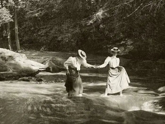 28、1910年,两个好朋友在溪流中漫步。