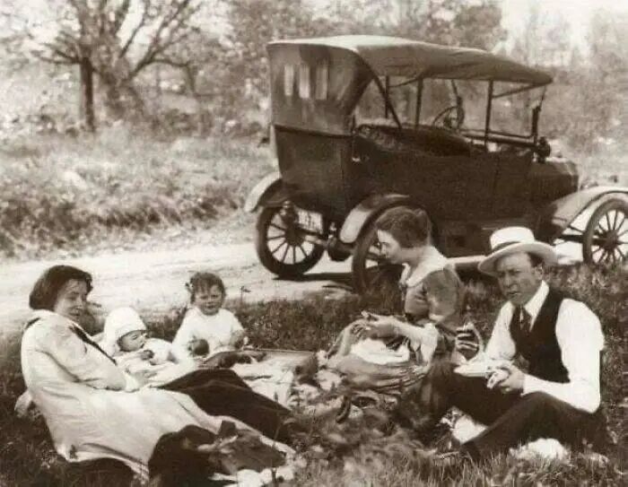 27、1918年,一家人在路边野餐。