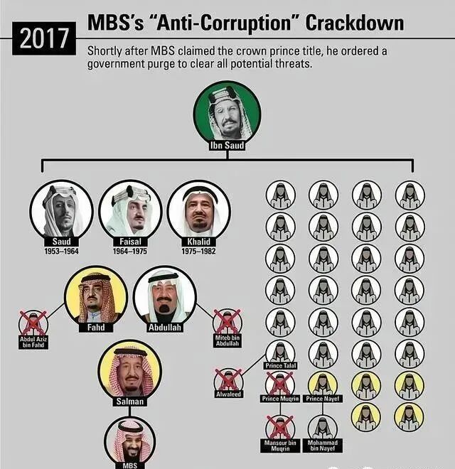 在这场风暴中,他亲手抓捕了他的堂兄、叔父和侄子,都是自己的亲人,多达11人,另外还有100多名军官和商界的富豪,其中就有被大家熟知的世界顶级富豪瓦利德王子。在这场风暴中,有1人在拘押期间死亡,有104人通过支付1000亿美元赎金的代价,换取了人身自由,另外还有95人不愿意支付赎金还在关押之中。