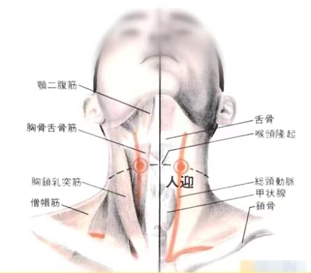 「寸口脉」,我们知道在哪儿了,在我们左手腕、右手腕那个地方。人迎脉在哪儿呢?很多初学者还不知道,其实就在我们脖颈的前方,在我们喉结的左右两侧。详细的位置,大家可以网络上搜索一下,这是人迎脉。
