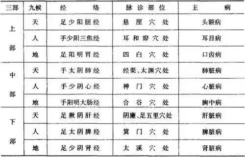 岐伯曰:有下部,有中部,有上部,部各有三候,三候者,有天有地有人也,必指而导之,乃以为真。上部天,两额之动脉;上部地,两颊之动脉;上部人,耳前之动脉。中部天,手太阴也;中部地,手阳明也;中部人,手少阴也。下部天,足厥阴也;下部地,足少阴也;下部人,足太阴也。故下部之天以候肝,地以候肾,人以候脾胃之气。