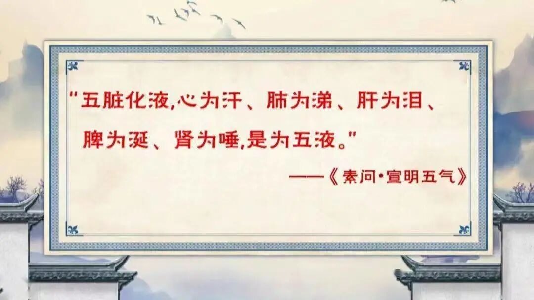 五脏化液(五脏所化生的液体)分别是这样的——心脏化生的液体是汗;肺脏化生的液体是涕(鼻涕的「涕」);肝脏化生的液体是泪水;脾脏化生的液体是涎液(就是口水,流出来的口水);肾脏化生的液体是唾液。