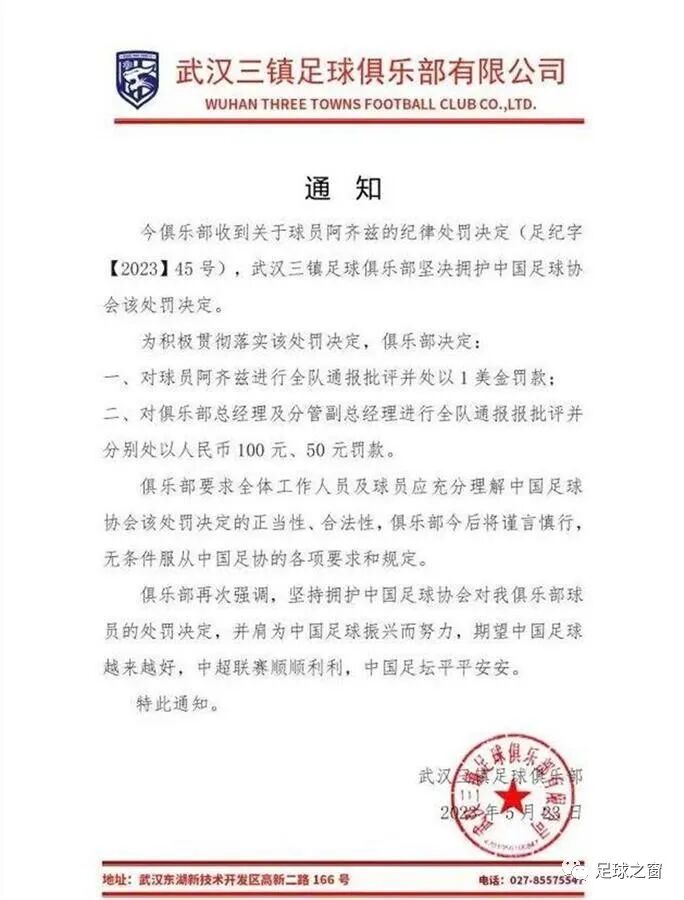 在题头为“武汉三镇足球俱乐部有限公司”的这纸内部处罚通知中,武汉三镇足球俱乐部表示,坚决拥护中国足协的处罚决定。除对阿齐兹处以通报批评,并处以1美元罚款外,武汉三镇足球俱乐部还对俱乐部总经理和副总经理分别罚款人民币100元和50元。