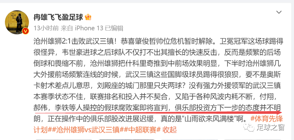 众所周知,此次足坛反腐反赌尚未结束,像李铁、郝伟等人到底是操纵了哪些比赛,与武汉三镇关系密切的付翔为何被抓,至今没有明确的答案,而冉雄飞在直播时,也是明确表示武汉三镇这支球队非常诡异,如果他们不想要荣誉,为何会硬刚足协,但是在夺取联赛冠军后,为何在占据绝对优势的情况下,给所有外援放假,将足协杯冠军拱手想让,要知道,双冠王这个荣誉并不是每支球队都能获得的。