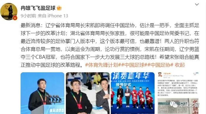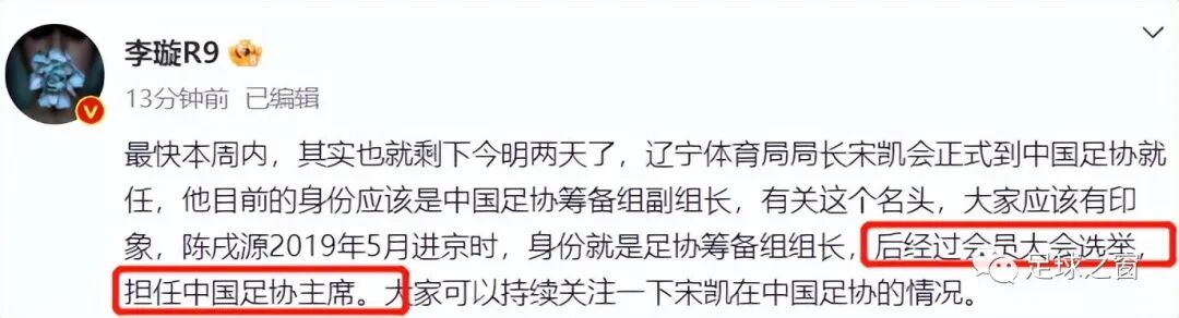 《足球报》记者李璇也同样确认消息属实,最快本周内,也就是今天和明天,辽宁体育局长宋凯会正式到中国足协就任,他目前的身份是中国足协筹备组副组长,而陈戌源在2019年5月,他刚到足协的职位就是足协筹备组组长,后来经过选举大会,担任中国足协主席。