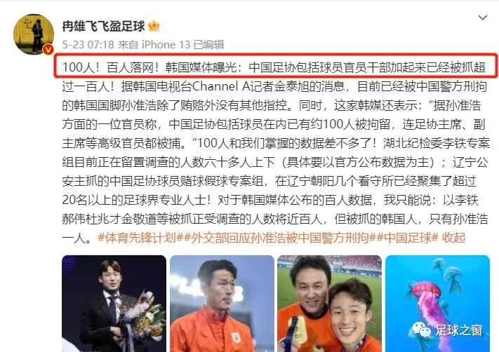 此前,据韩媒报道,中国足坛扫黑反腐大约100人被抓,而记者冉雄飞也透露,100人这个数字大致准确,其中,湖北纪检委主要负责李铁案,先后带走了大概60人,而辽宁警方主要侦办中超假球案,带走了超过20人,还有一些体坛官员的家属,包括足协秘书长刘奕的妻子、赛艇协会主席刘爱杰的妻子以及陈戌源儿子。总之,2023年足坛反腐规模非常大,而63岁的杜兆才被抓,也创造纪录,他成为中国足坛史上被带走调查职位最高的体坛官员。