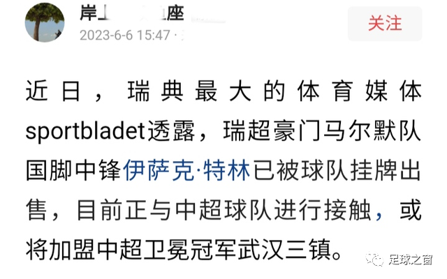 不久前,据国内媒体人“岸……座”引外媒“Sport bladet”报道,瑞超豪门马尔默的主力中锋伊萨克·特林已被球队挂牌,而现在正有中超球队有意签他,而这支球队就是上赛季的中超冠军武汉三镇。资料显示,特林现年30岁,身高1米89,来自瑞典,身价220万欧元,已10场进8球。从资料来看,他和三镇前大腿马尔康的特点非常像,因此也有望带飞汉军。