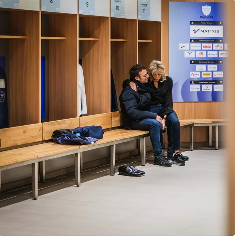 在开始集会发言前,马克龙和布丽吉特依偎在更衣室的角落。