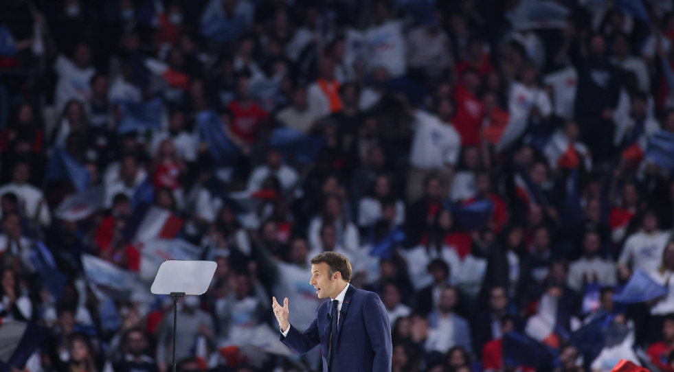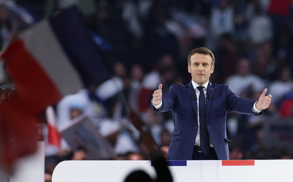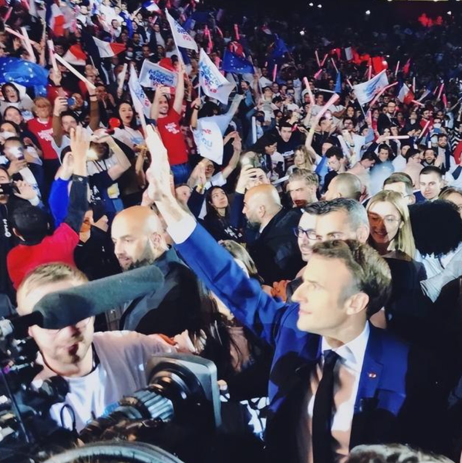 这一幕发生在马克龙竞选前夕集会的发言结束后,这位年轻的总统以他翩翩的风度,自信的气场和激昂的演讲,征服了在场三万多的群众。