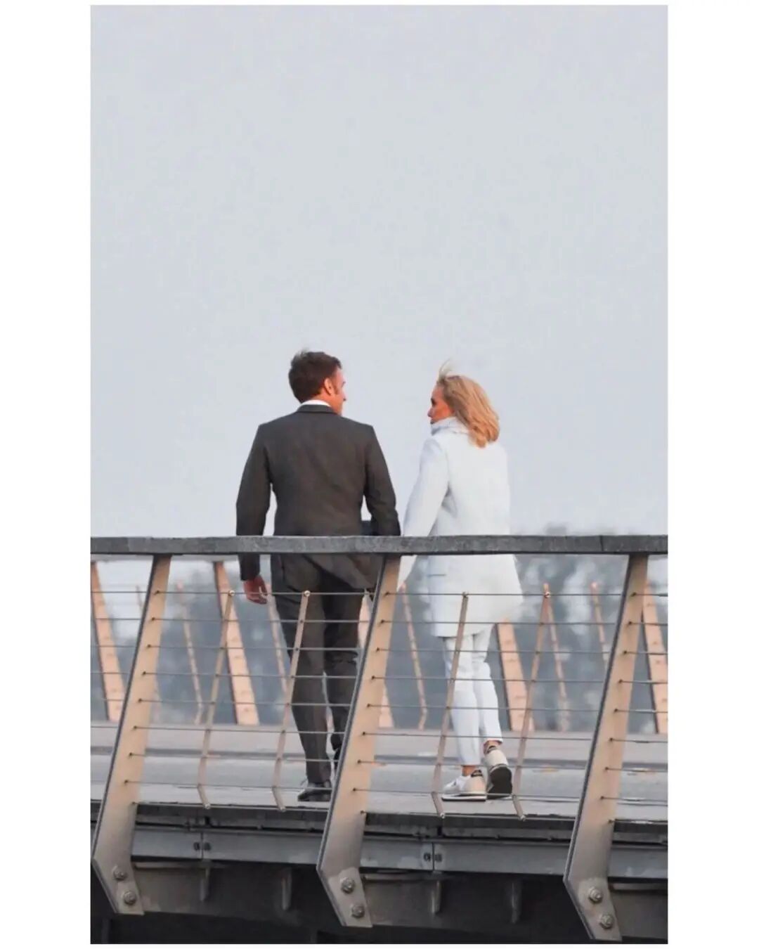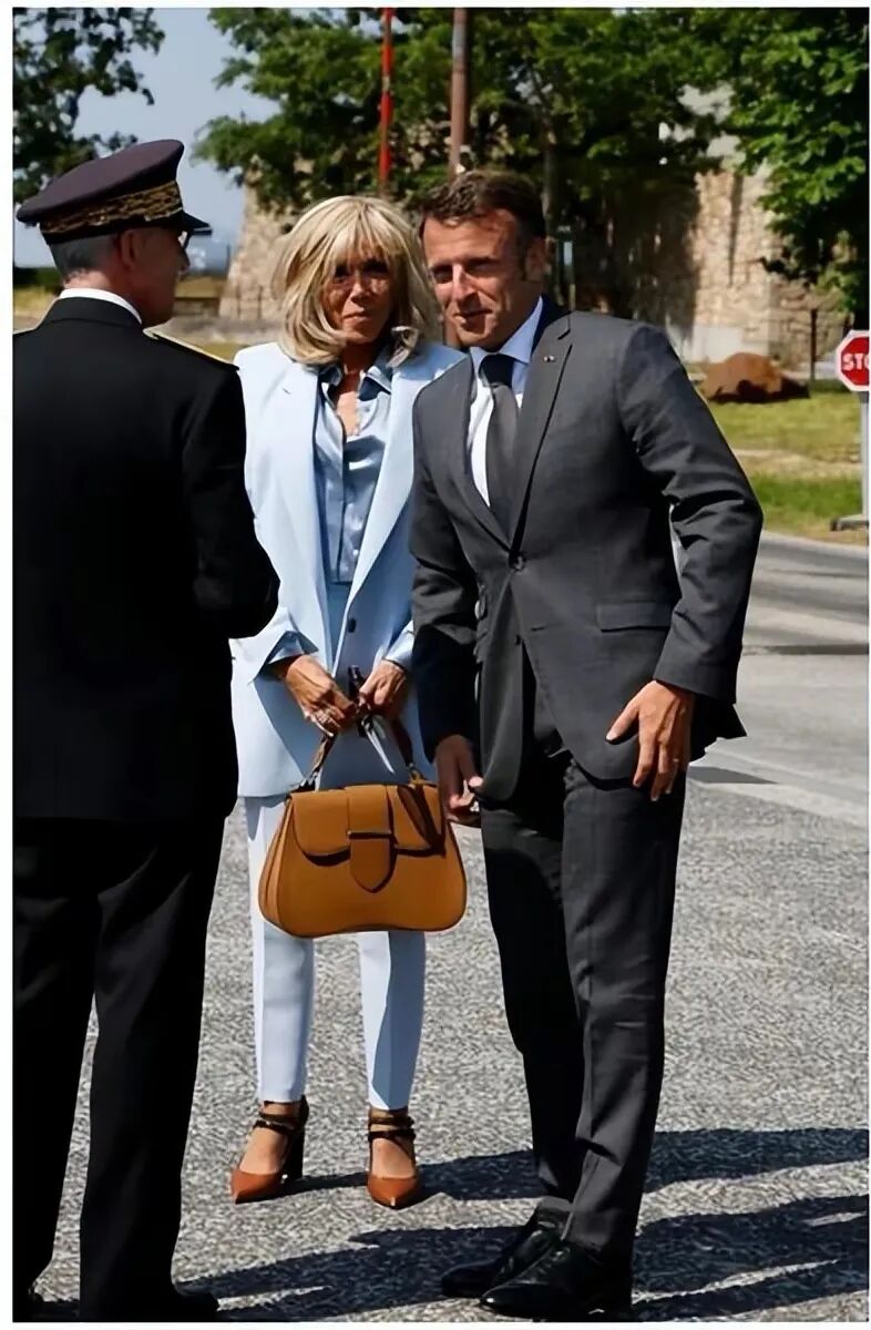 布里吉特当天的高跟鞋也非常漂亮,那双棕色的复古皮鞋使浅蓝色的服装更显质感。只见她挽着马克龙的胳膊,自信满满地走在一旁。