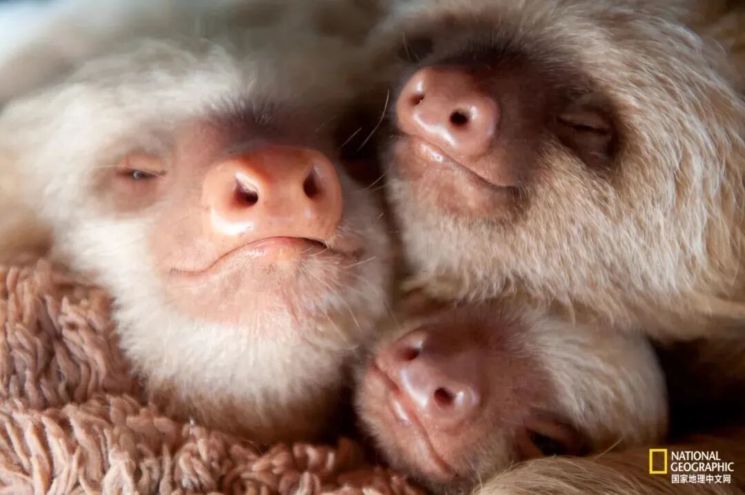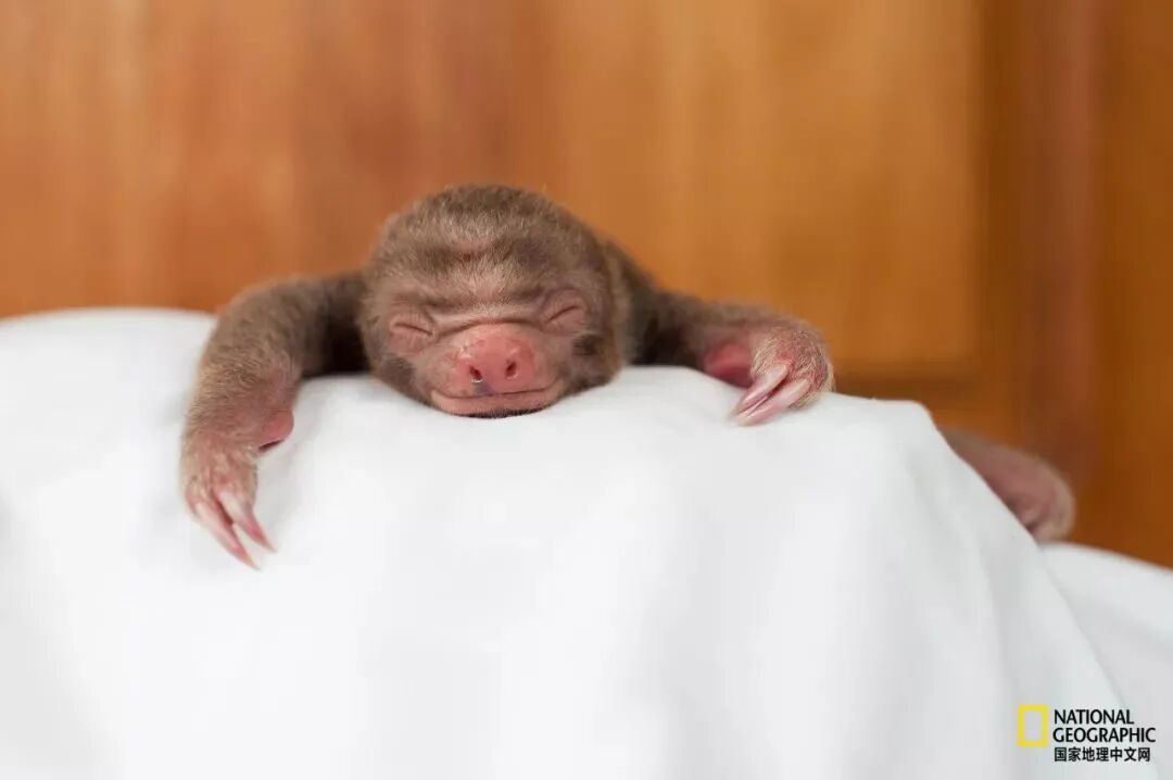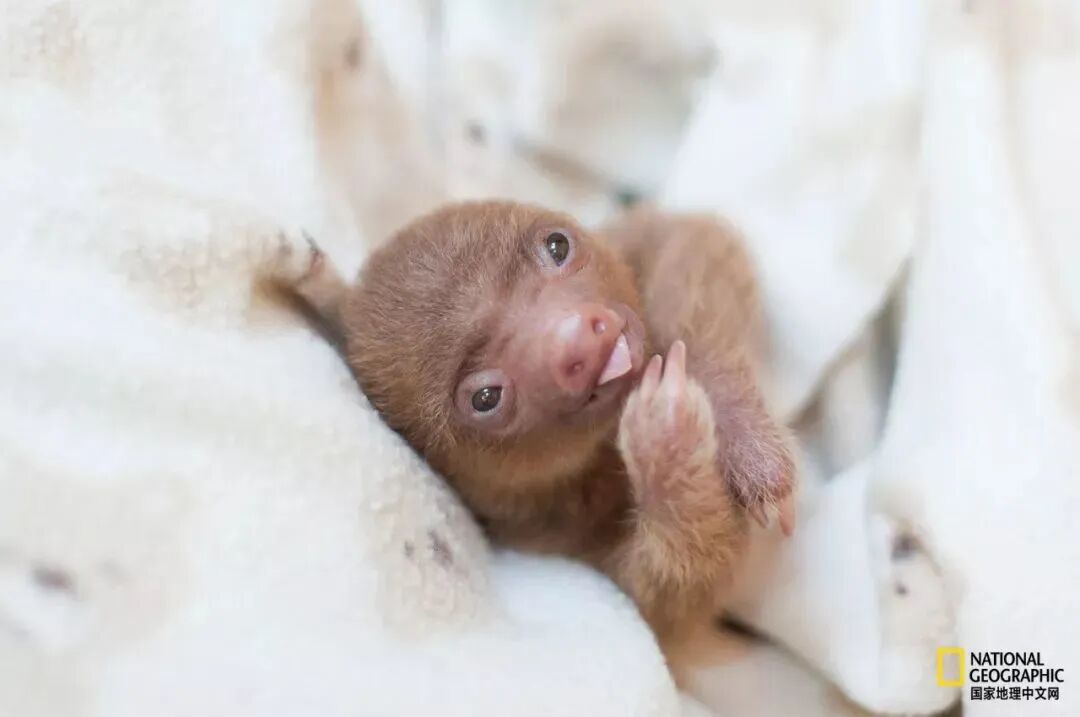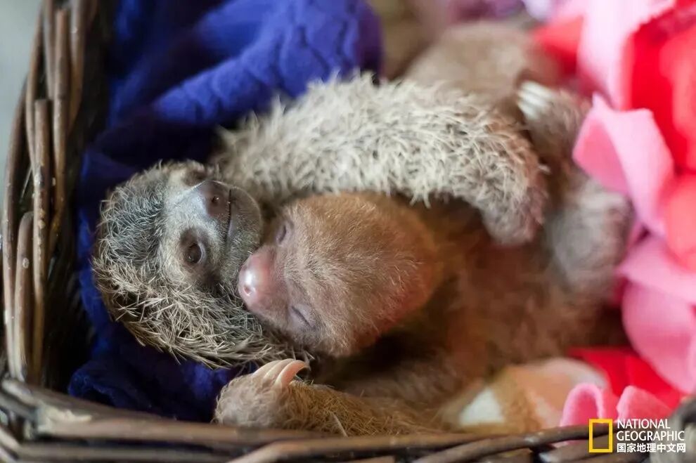 一只月大的三趾树懒,它爪子上的木槿花是它最爱的零食之一。