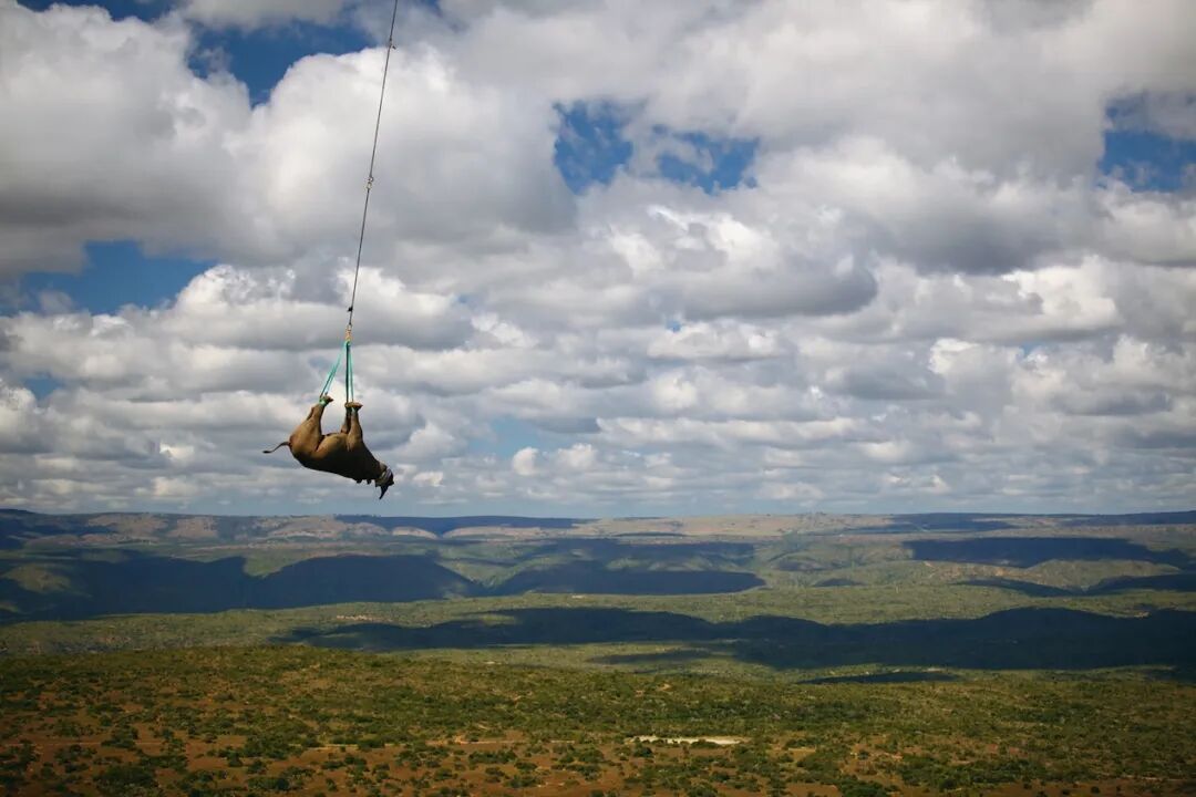 空运可以将被盗猎的犀牛迅速从许多难以进入的崎岖地形中移出,是保护它们的有效手段。