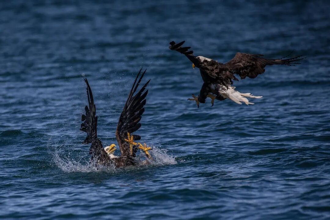 老鹰因食物和领地发生争执的情况并不少见,有时会以空战告终,就像正在发生的那样,其中一只在水里迫降。