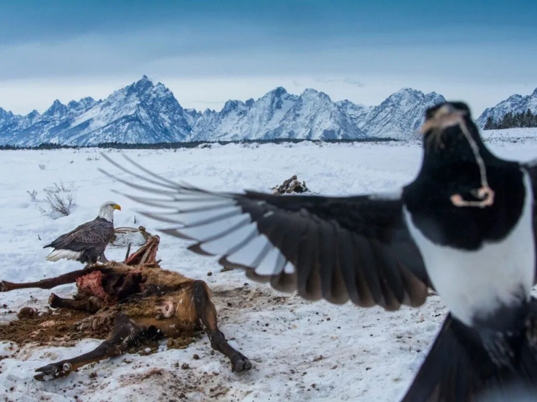 这是数万张乌鸦、喜鹊和白头海雕的图像中的一张,它们在麋鹿上空中断红外光束时触发了相机——只可惜,没有狼。