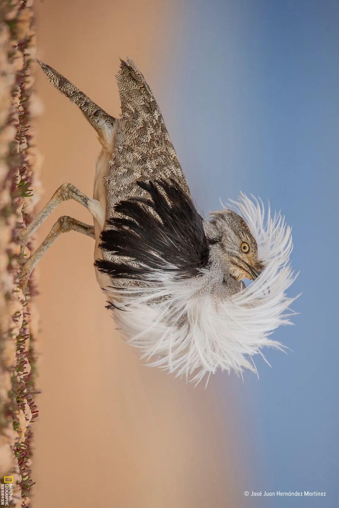 一只雄性加那利群岛波斑鸨正在跳着它的求偶舞。来自西班牙的摄影师José说,他必须钻进沙子里,才能找到拍摄这只奇特的鸟的最佳角度。这张照片获得了2022年野生动物摄影师大赛动物肖像类别奖。