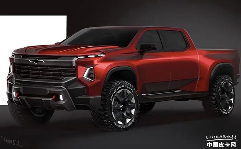 外观部分,新车整体风格更加SUV化,甚至有一些新款CAMARO大黄蜂的感觉。前中网依然采用现款的整体设计,但是中部带有雪佛兰标志较宽的横幅更加靠上,两侧连接狭长的LED日行灯,让中网的视觉重心提升了不少。中网下部的两侧则是前大灯的位置,与上汽大通T90有些类似,都采用了分离式的前大灯。保险杠部分非常有肌肉感,红色的拖车钩外露,并且延伸到车底的护板很厚重。车辆侧面非常流畅,没有多余的线条设计。从设计图来看,该车还将有可能配备百路驰Baja全地形轮胎。