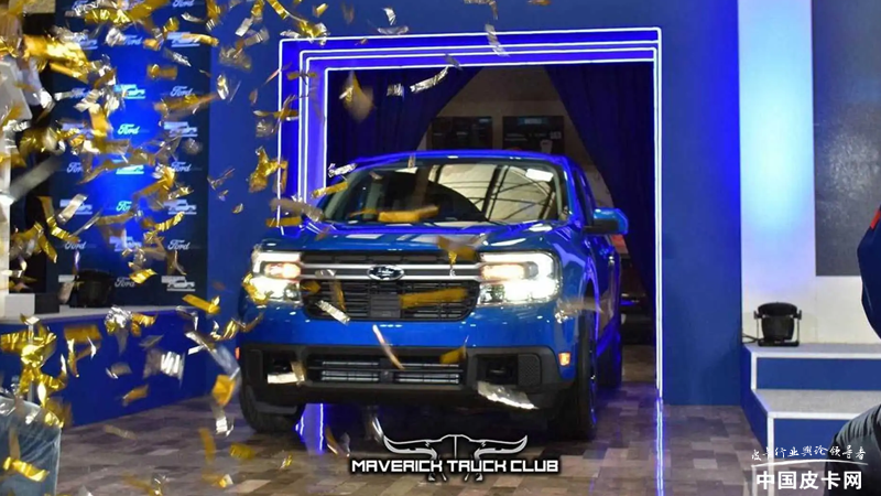 首辆下线的福特Maverick皮卡采用了蓝色涂装,目测是顶配Lariat车型,车辆搭载了2.0T EcoBoost四缸发动机,并且装配了四驱系统。从图片中似乎可以看出,新车配备了Co-Pilot360 系统的摄像头和传感器元件,这些配置来自于价值3340美元的Lariat豪华套餐。